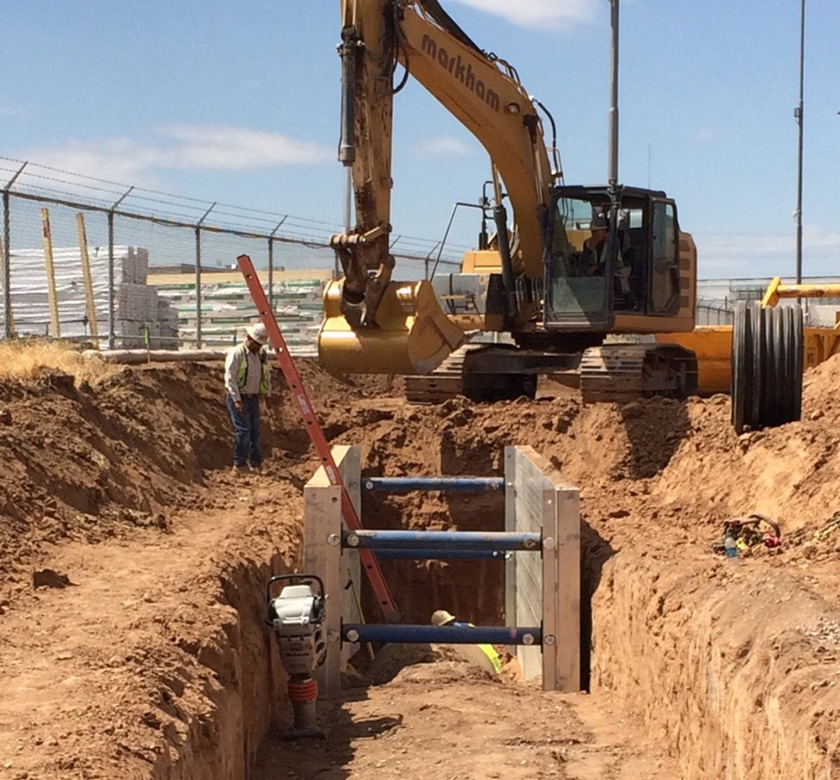 A trench shield is typically placed inside the trench after excavation. It commonly consists of two strong, parallel sidewalls or panels (usually made from steel or aluminium) held apart by fixed or adjustable struts or spreader bars. These walls act as a barrier between the worker and any collapsing soil for the full depth and length of the trench, from ground level down (and sometimes above!) Unlike sloping or benching, shields can be used in any soil type.