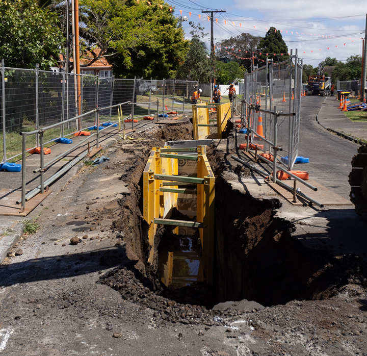 Trenches with obstructions like pipes or cables in them, or for manholes.