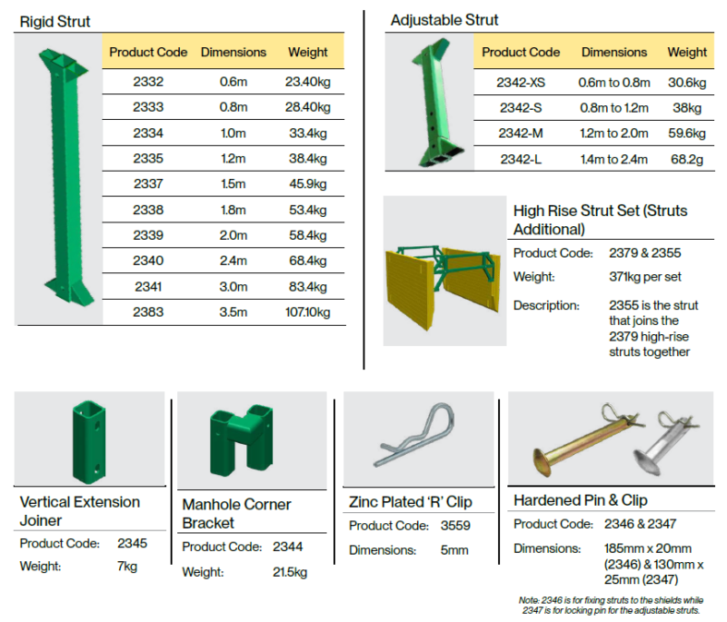 Multiple strut points mean you’re not locked into one position when services are in the way. Detachable 600mm legs keep shields off the trench bottom when pipes or cables run underneath. Adjustable struts (0.6m-3.5m) accommodate different trench widths.