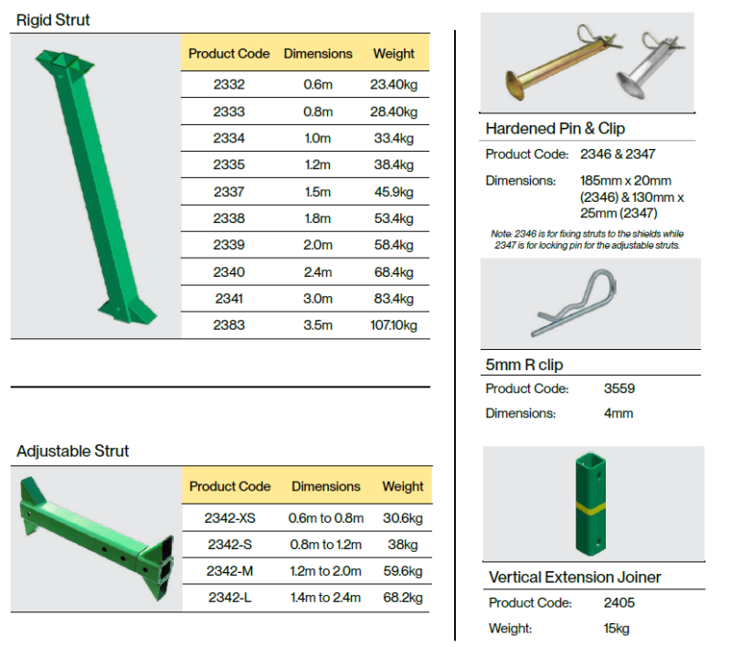 Choose from our range: 2.0m, 2.4m or 3.0m options. The option of using fixed or adjustable struts (ranging from 0.8m to 2.4m) allows you to tailor the box to different trench widths and project requirements, while still having the under-strut clearance for a pipe to pass through the shield.