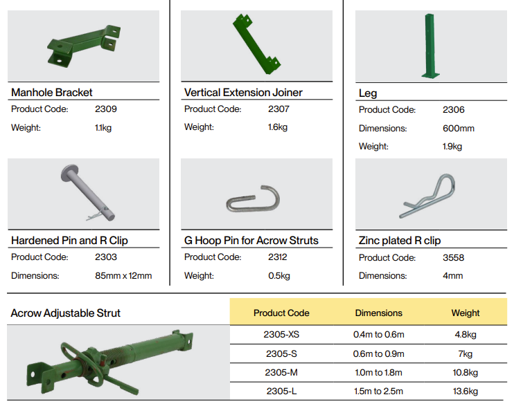 Multiple strut points mean you’re not locked into one position when services are in the way. Detachable 600mm legs keep shields off the trench bottom when pipes or cables run underneath. Adjustable struts (0.6m-3.5m) accommodate different trench widths.